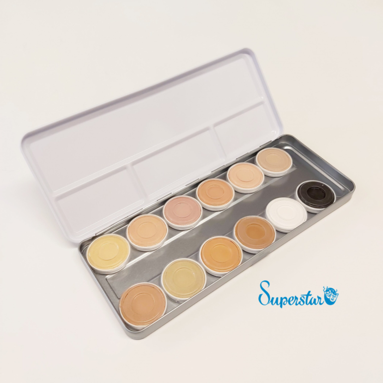 Dit palet bevat de 10 meest gebruikte huidskleuren uit het assortiment, aangevuld met wit en zwart. Je gebruikt eerst een basiskleur en met al deze tintjes kan je dan over de basis heen hele mooie schaduwen maken. Ook prima te gebruiken voor de fotograaf om net even een paar kleine huidafwijkingen te kunnen camoufleren. Een must voor de serieuze grimeur en bovendien zeer prettig geprijsd. Bij onze losse kleuren waterschmink vindt u alle omschrijvingen per kleur.