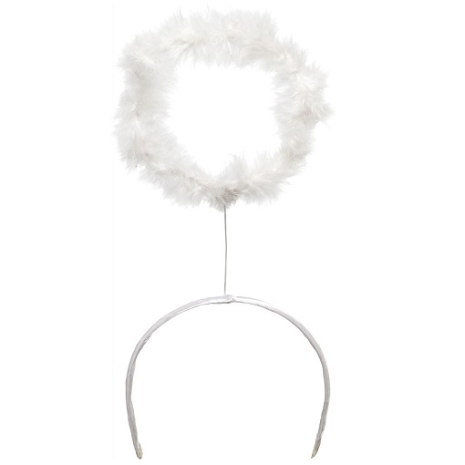 Leuke diadeem met een witte halo of aureool gemaakt van veertjes. In het maraboe zitten kleine zilveren sliertjes verwerkt. One size, past altijd. Perfect voor een engel.
