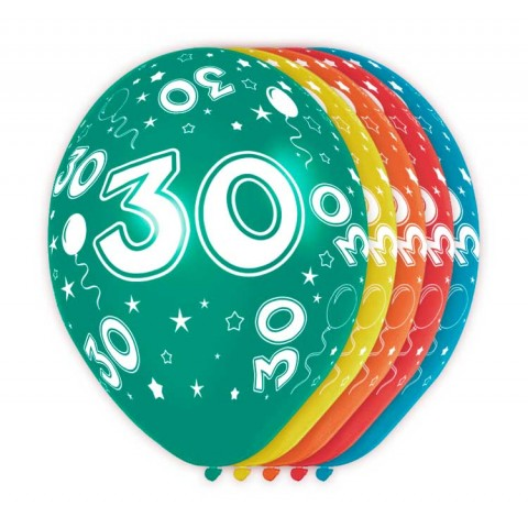 Mooie grote 30 jaar ballonnen van ongeveer 30cm groot. Speciaal bedrukt voor hangend of staand ophangen. Hangend wil zeggen met gewone lucht opblazen en staand wil zeggen opblazen met helium of op een stokje. 5 stuks in een zakje. Mooie metallic kleurtjes, dus glimmend.