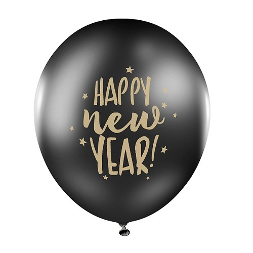 Een zakje met 6 zwarte ballonnen met gouden Happy new year opdruk. De ballonnen zijn 30cm groot en ook goed geschikt om met helium te vullen.