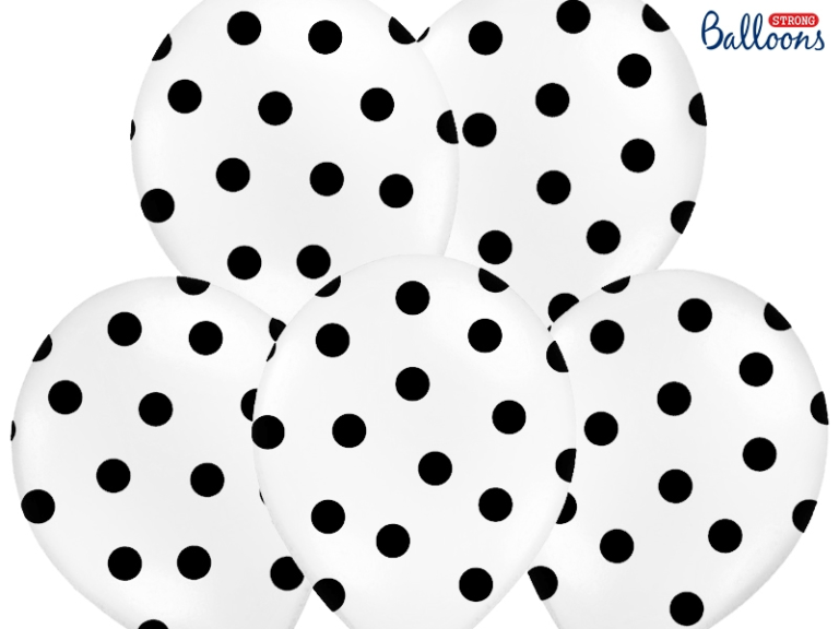 Zakje met 6 witte ballonnen met zwarte dots. Deze polkadot ballonnen zijn 30cm groot en zijn eventueel ook goed geschikt om met helium te vullen.