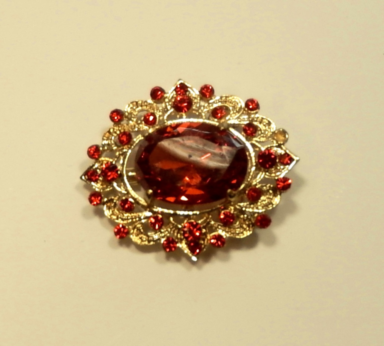 Zeer fraaie, kleine baretspeld. Ietwat ovaal met rode steen in het midden en kleine steentjes langs de zijkant. Aan de achterkant een speld om m op de baret te zetten, en een klein gootje, waarin 1 of 2 floss (dunne) veren gestoken kunnen worden