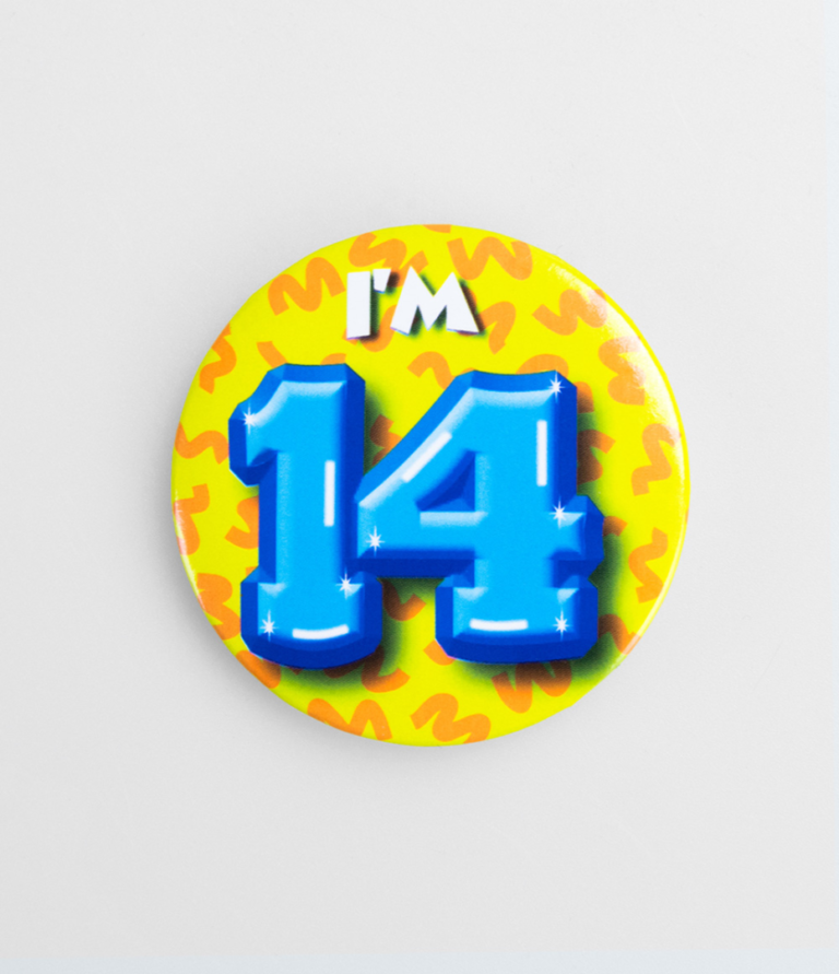Button 14 jaar. Leuk om de jarige mee te verrassen.