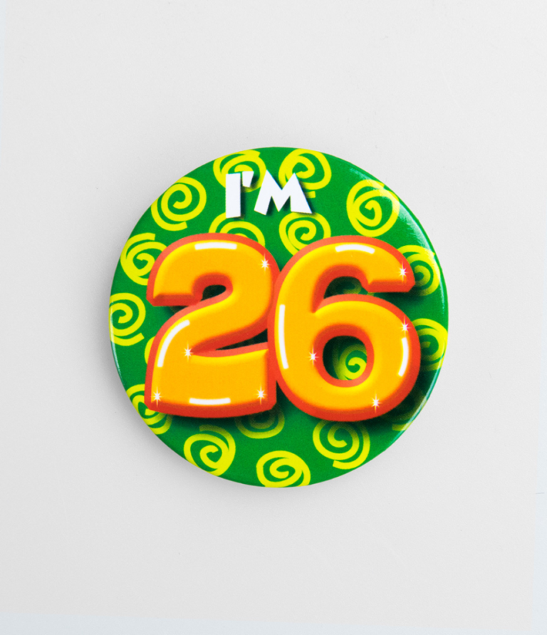 Button 26 jaar; Leuk om de jarige mee te verrassen.