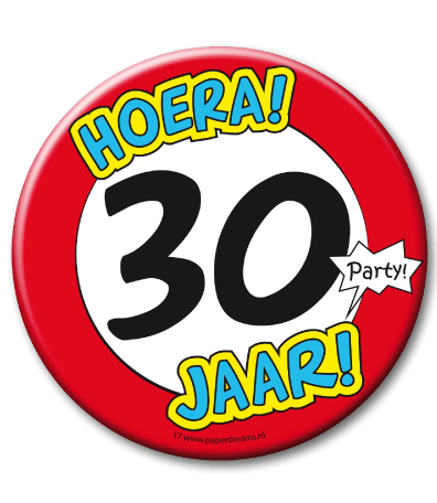 Extra grote button met de tekst hoera 30 jaar! Leuk om de jarige op zijn speciale dag mee te laten rondlopen. De button is 10cm doorsnee.