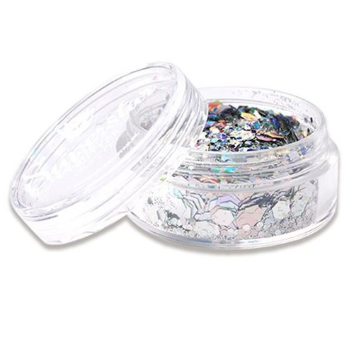 Een doosje met 6 gram chunky glitters. Chunky betekend in dit geval dat de glitters verschillend van vorm en formaat zijn. Deze laser silver chunky glitters hebben een zilveren kleur en zijn dé nieuwe festival trend. Breng hem op met huidlijm of simpelweg met de paint glow glitter fix gel en je hebt een geweldig effect!