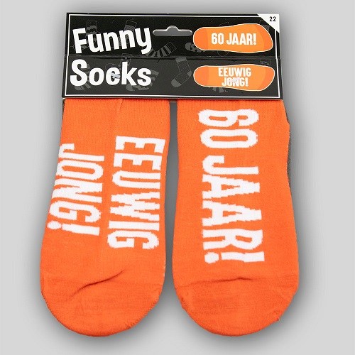 Een paar vrolijk gekleurde sokken met de tekst 60 jaar, eeuwig jong. One size, ongeveer maat 40/43.