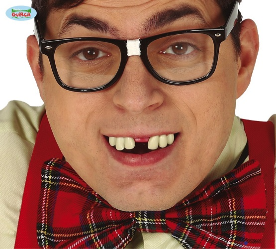 Grappig gebitje met twee missende voortanden. Het gebit is al voorzien van een dental fix waarmee je het gebit op je tanden kunt plakken. Gooi het hele gebitje in heet water en de dental fix wordt zacht, waarna je het gebit op je eigen tanden drukt.
