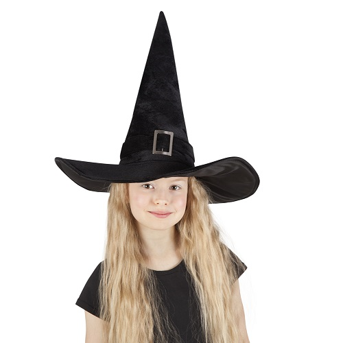 Mooie imitatie fluwelen zwarte heksenhoed voor een kind met een grote zilveren gesp op de voorkant.