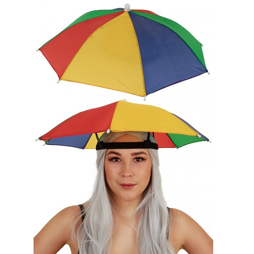 Een elastieken band met daarop een paraplu. Super makkelijk als het regent! De parapluhoed is in en uit klapbaar.