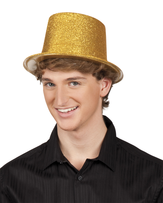 Plastic hoge hoed met gouden glitters. One size, ongeveer hoofdmaat 58.