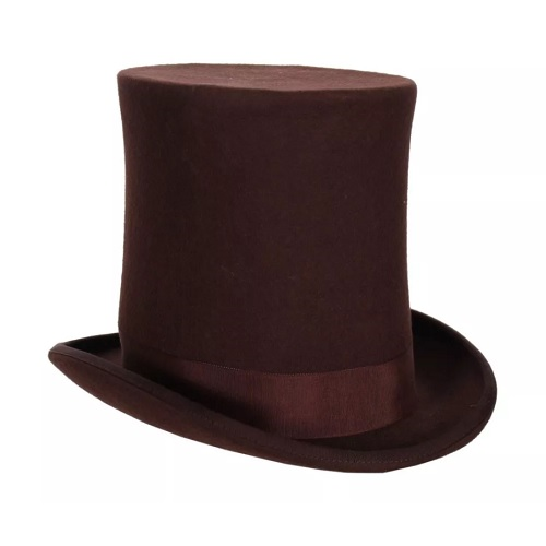 Echt wolvilten hoge hoed van een professionele kwaliteit. Dit exemplaar is extra hoog, want dat is voor sommige stijlen heel belangrijk. We hebben hem in verschillende maten. De hoed is 21 cm hoog. De kleur is bruin.