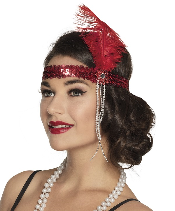 Mooie elastische rode Charleston hoofdband met pailletten en een veer, die je peaky blinders, great gatsby of jaren 20 outfit helemaal afmaakt.