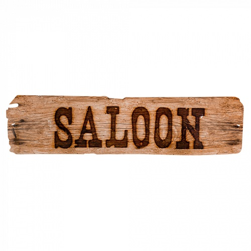 Kartonnen decoratie bord dat eruit ziet alsof hij van hout is gemaakt. Dubbelzijdig bedrukt met de tekst SALOON.