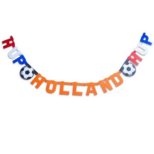 Kartonnen slinger met de tekst Hup Holland Hup. Deze letterslinger is leuk tijdens het EK of WK voetbal en kun je bijvoorbeeld voor het raam of aan je tuinhek hangen.