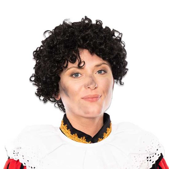 Mooie ruim vallende ietwat langharige super mooie pietpruik. Helemaal verstelbaar, verlengstukje in de nek, mooi gevormd rond de oren. Natuurlijk is de piet pruik geheel wasbaar.