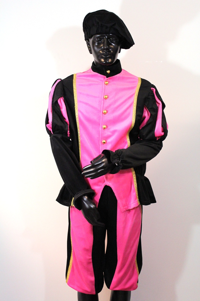 Mooi Piet kostuum in een hele goede kwaliteit/prijs verhouding. Dit pak van imitatie fluweel is gewoon wasbaar in de wasmachine, ziet er goed uit en is goed betaalbaar. U krijgt een baret, een jas en een broek. In de chique combinatie roze-zwart blauw. Kies bij twijfel over de maat altijd een maat kleiner. De pakken vallen namelijk heel ruim.