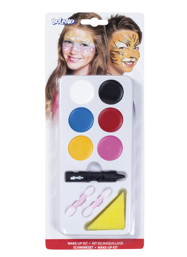 Mooi schmink palet op waterbasis met 7 kleurtjes en een oogschaduwpenseeltje waar je de schmink mee op kunt brengen.
