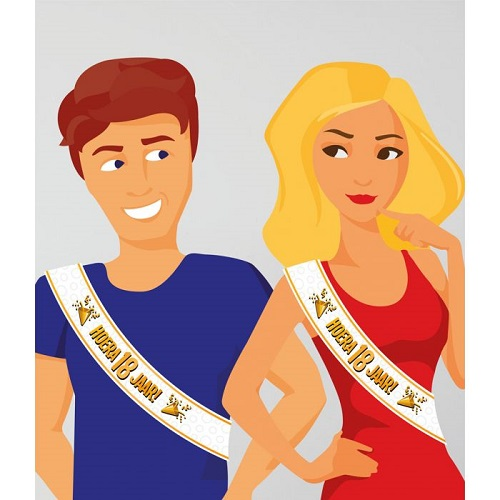 Witte satijnen sjerp met de tekst Hoera 18 jaar! Een leuk cadeautje om de jarige de hele dag mee te laten lopen.