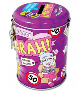 Spaarpot voor de jarige job die een 50 jarige Sarah gaat worden! Van blik en afsluitbaar met een sleuteltje.