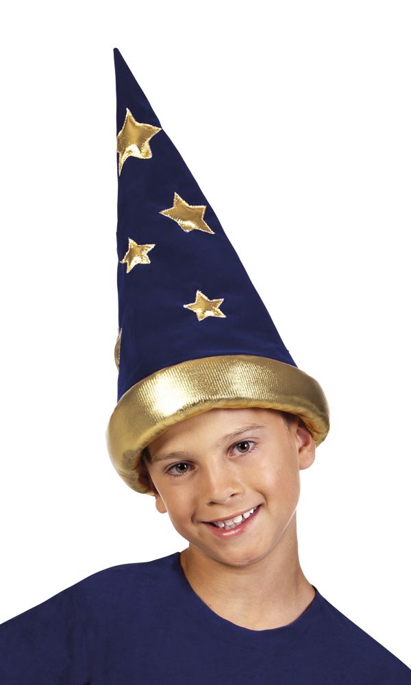 Prachtige hoed voor een Tovenaar. Blauw met gouden sterren. Ongeveer hoedenmaat 58. Dus geschikt voor kinderen en volwassenen. Lijkt een beetje op de hoed die Mickey Mouse draagt in Fantasia.