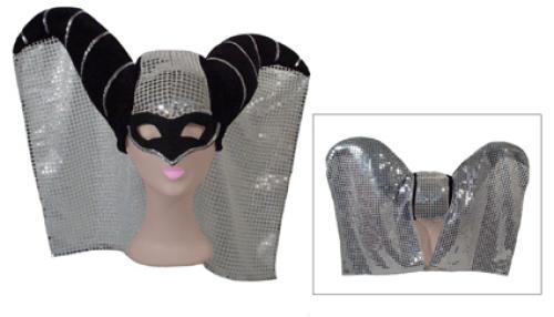 Grote muts met oogmasker en glitterpaillettendoek tussen de bogen