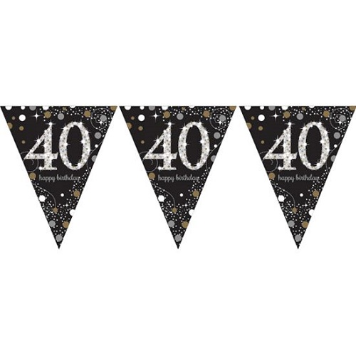 Mooie zwart met gouden en zilveren vlaglijn of slinger met 40 erop. De 40 jaar slinger is 4 meter lang en enkelzijdig bedrukt. De achterkant van de slinger is wel bedrukt met een glitterende zilveren print.