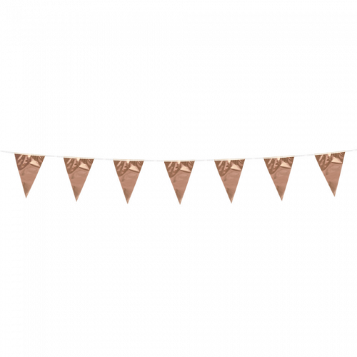 Kleine mini slinger in het glimmende rosé goud. Deze rosé gouden vlaglijn is 3 meter lang en heeft kleine punt vlaggetjes van 15cm groot. Van plastic, dus ook goed geschikt om buiten op te hangen.